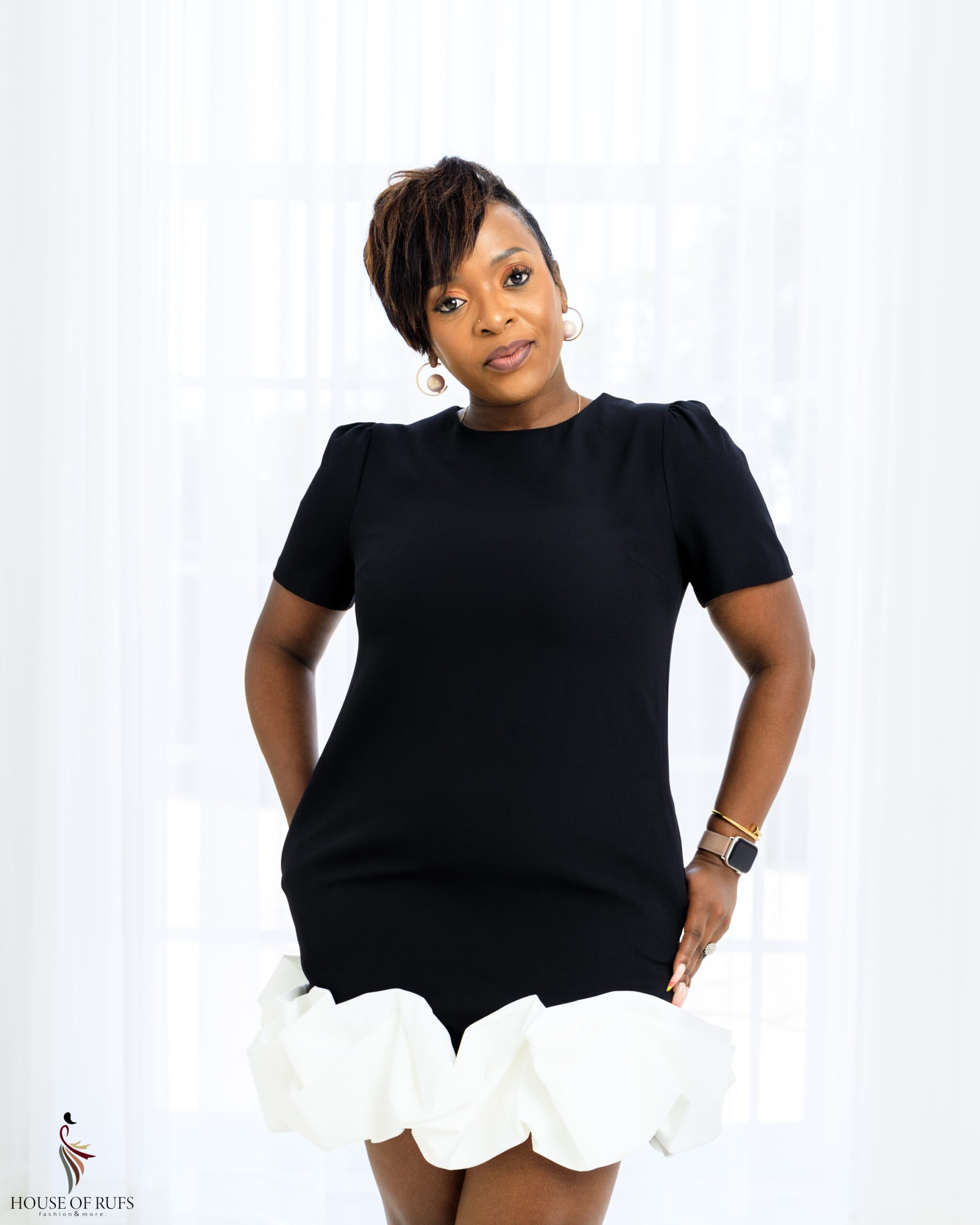 Black playful short dress with white bottom frill design